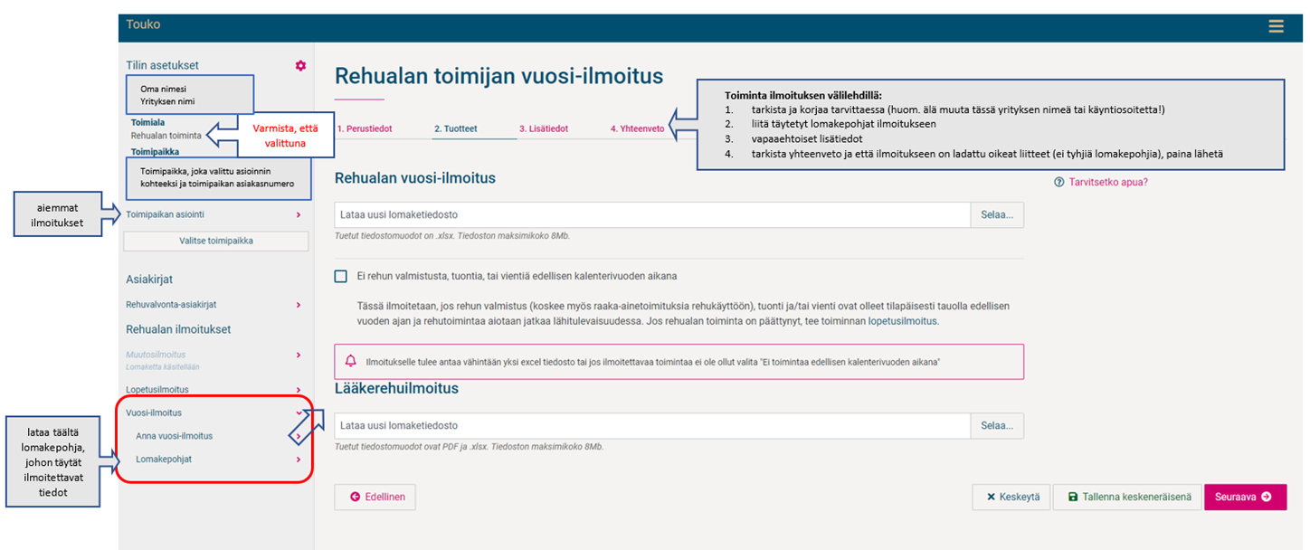 - Ruokavirasto edellyttää vuosi-ilmoituksen antamista TOUKOn lomakepohjilla ja sähköisen asiointipalvelun kautta. Lomakkeita ei voi palauttaa eikä vuosi-ilmoitusta antaa muilla tavoilla.
