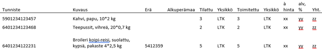 Tavanomainen, toimiva ja suositeltava tapa on eritellä lähetyksen sisältämät elintarvikenimikkeet tietoineen lähetyksen yhteyteen liitetyssä paperisessa tai sähköisessä asiakirjassa. Alla olevissa esimerkeissä 1 ja 2 on ilmoitettu rivikohtaisesti
