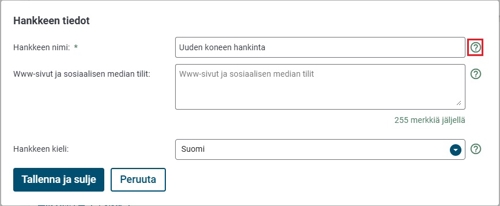 - Hankkeen nimi: Anna hankkeelle lyhyt ja hanketta hyvin kuvaava nimi.